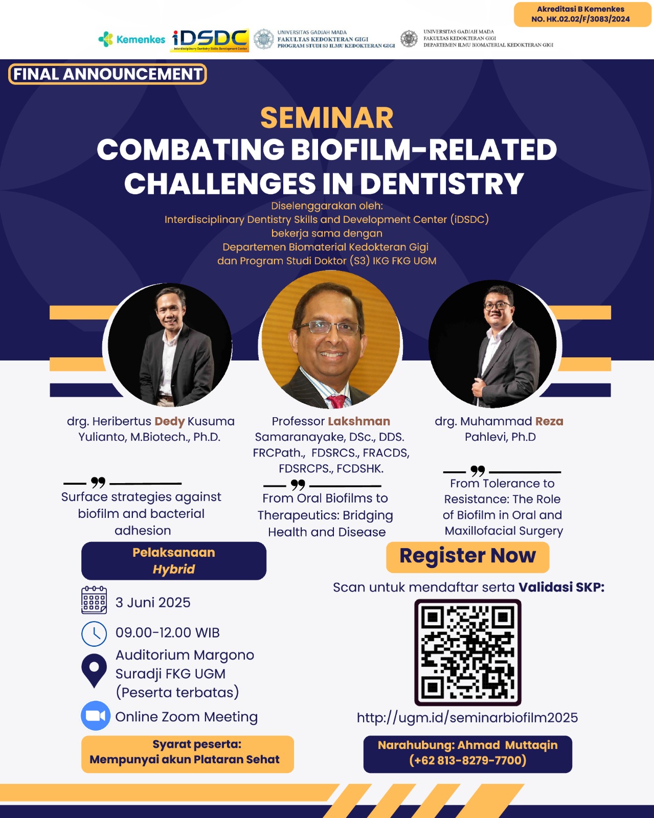 Bekerja sama dengan Departemen Biomaterial Kedokteran Gigi dan Program Studi Doktor (S3) IKG FKG UGM akan mengadakan Seminar: Combating Biofilm-Related Challenges in Dentistry. Seminar ini merupakan upaya untuk meningkatkan pemahaman dan kesadaran mengenai tantangan yang ditimbulkan oleh biofilm, resistensi antibiotik, serta berbagai pendekatan modifikasi permukaan (surface treatment modification) dalam menangani masalah ini. Dengan tiga narasumber yaitu: