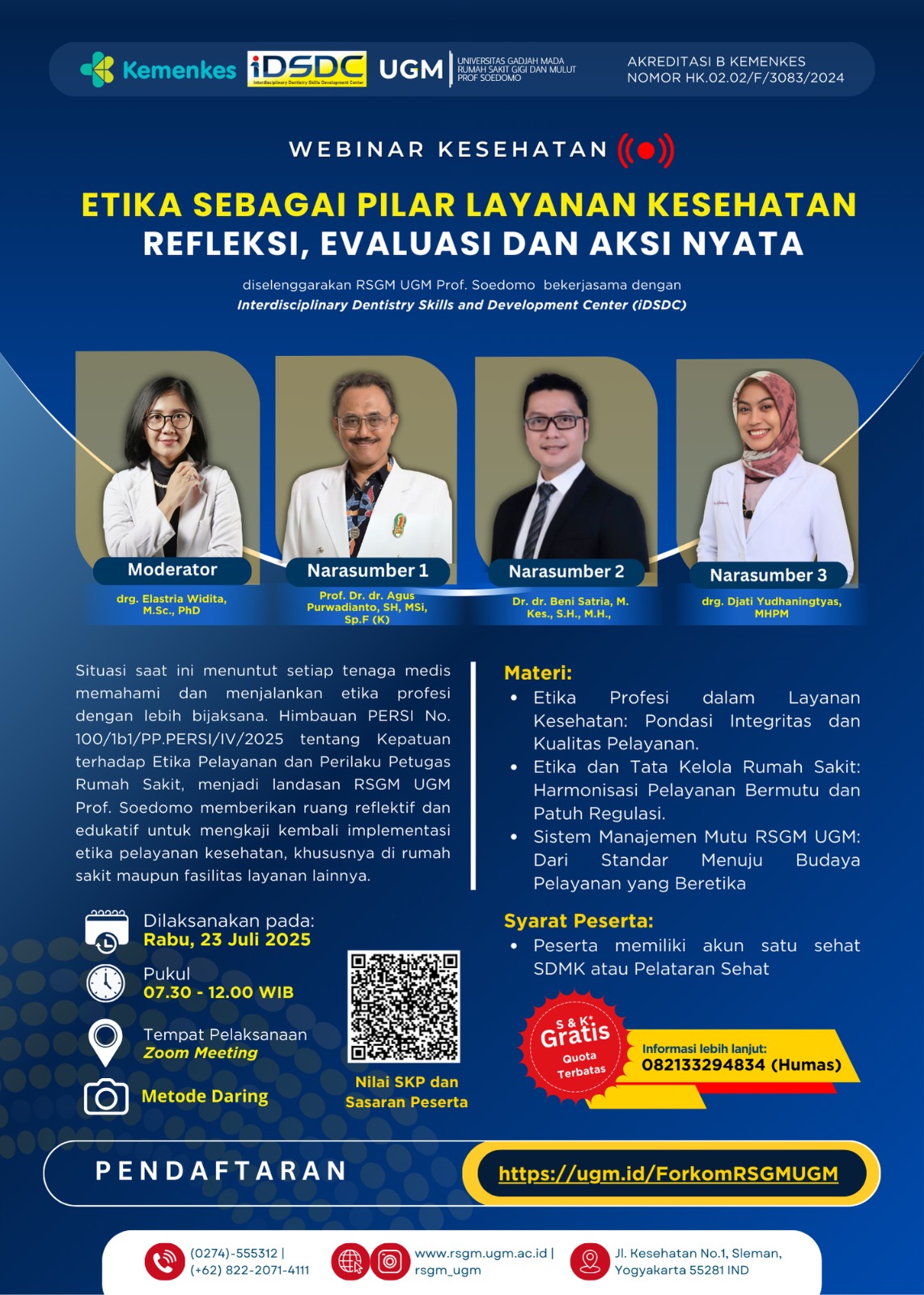 iDSDC bekerja sama dengan Rumah Sakit Gigi dan Mulut UGM Prof. Soedomo akan menyelenggarakan Webinar Etika Sebagai Pilar Layanan Kesehatan: Refleksi, Evaluasi dan Aksi Nyata pada 23 Juli 2025 pukul 7.30-12.00 melalui zoom meeting dengan narasumber: